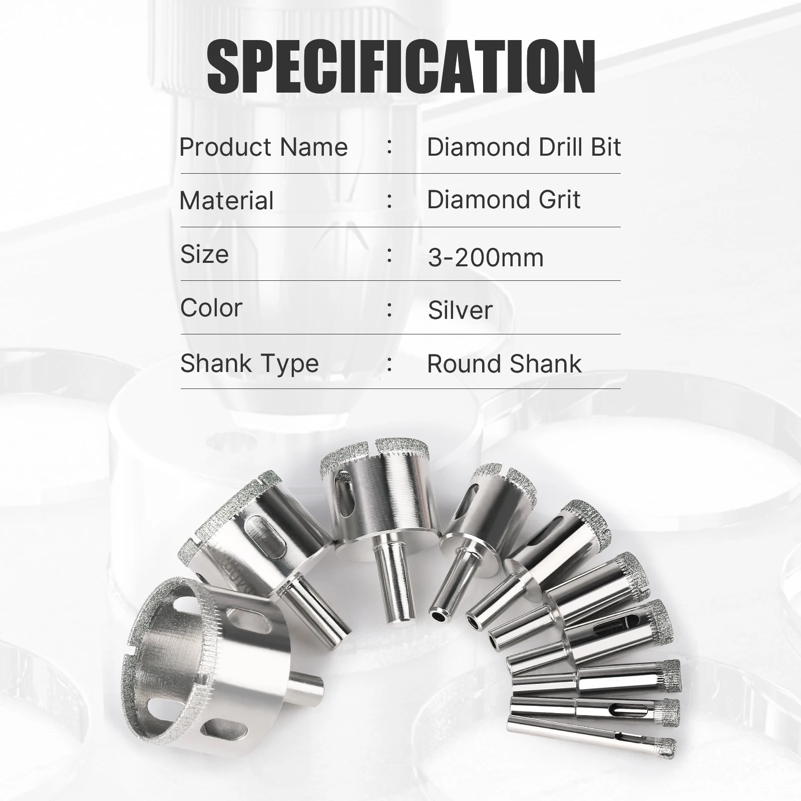 3-200mm Round Shank Hole Saw Diamond Coated Core Drill Bit Masonry Tools For Glass Marble Opener Ceramic Tile Porcelain Granite
